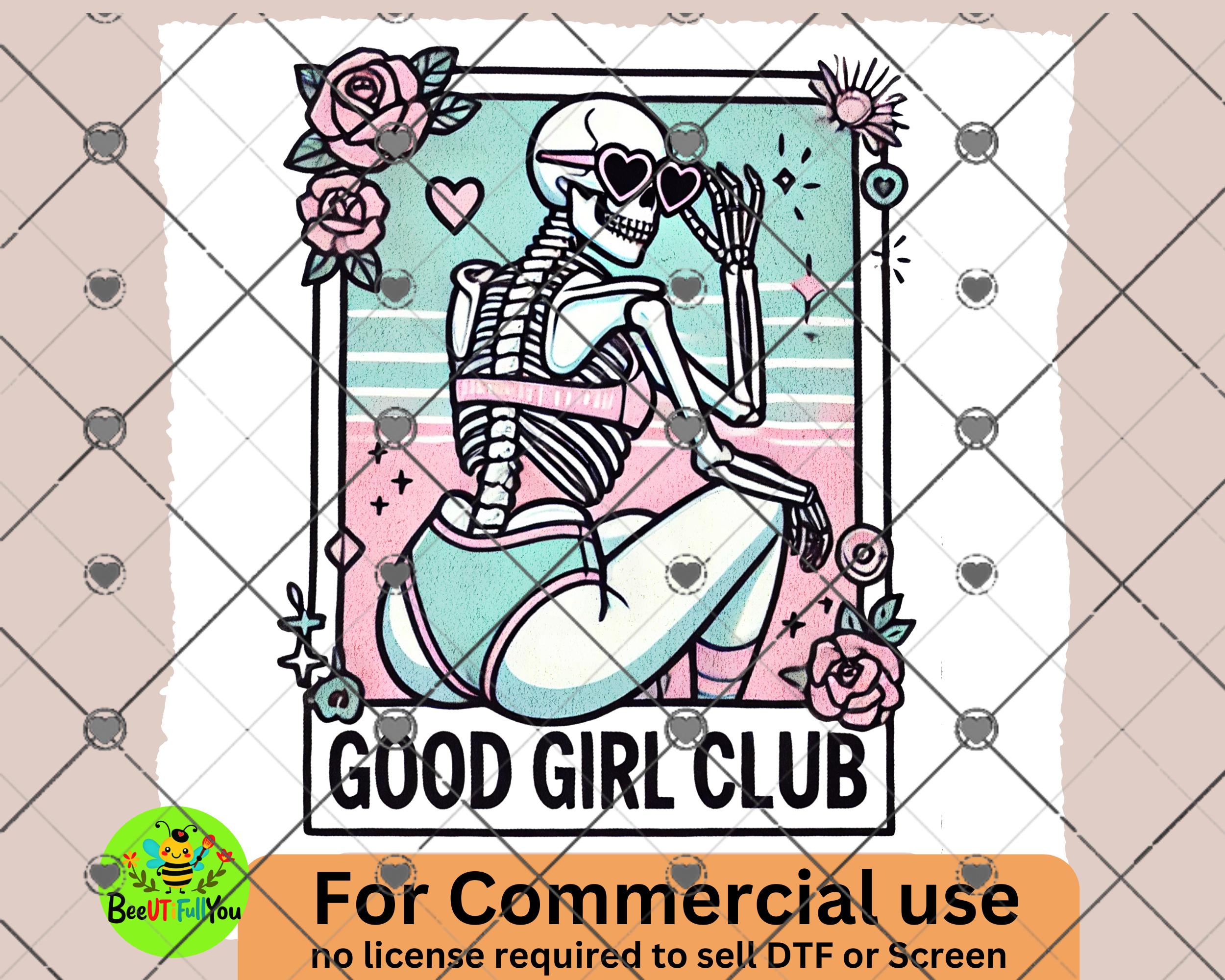 Step into the Good Girl Club with this stylish and edgy skeleton design! Perfect for creating bold and trendy digital or physical products. This design features a skeleton adorned with glittering hearts, floral elements, and a pop of retro pink aesthetic.
