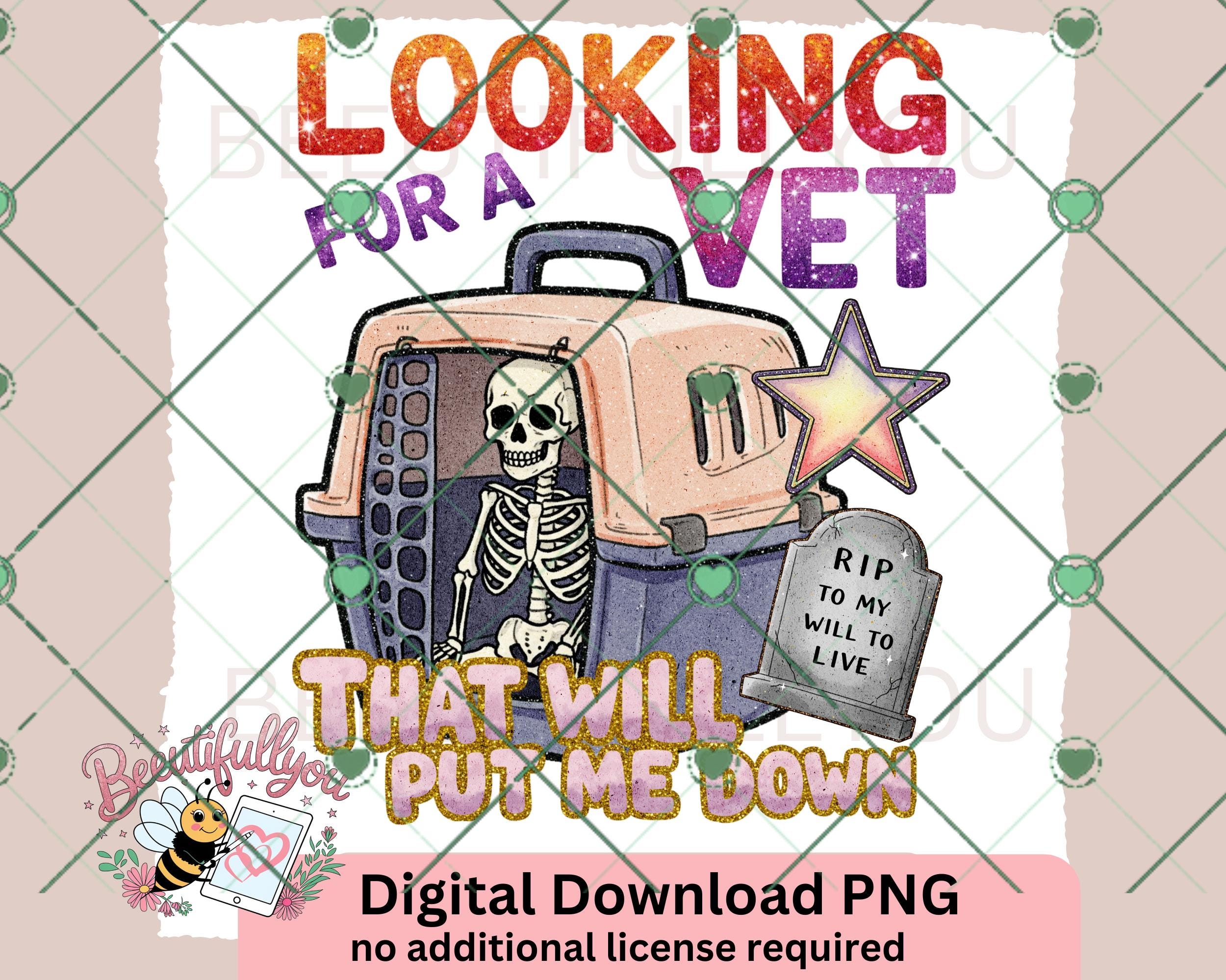 For those with a dark sense of humor, this "Looking for a Vet That Will Put Me Down" digital PNG design is the perfect sarcastic statement piece. Featuring a skeleton inside a pet carrier with a tombstone that reads "RIP to my will to live," this design is great for relatable humor lovers, vet techs, or anyone surviving adulthood one day at a time. Ideal for t-shirts, mugs, tumblers, and more!