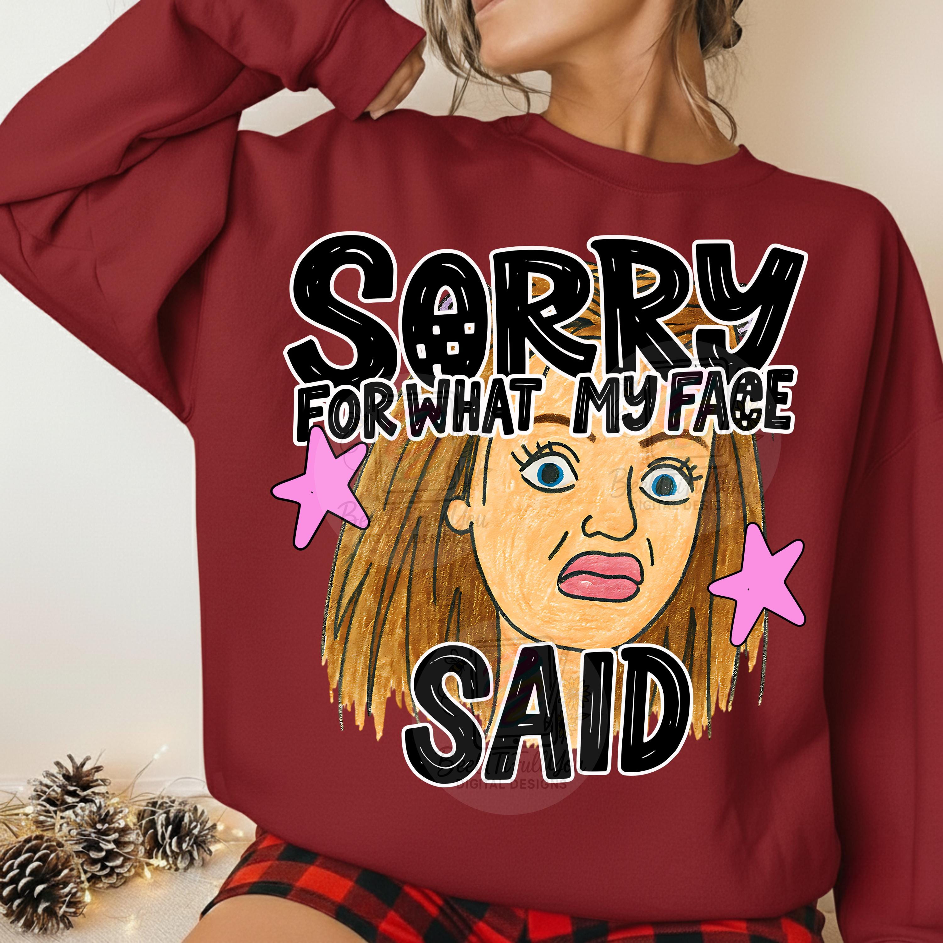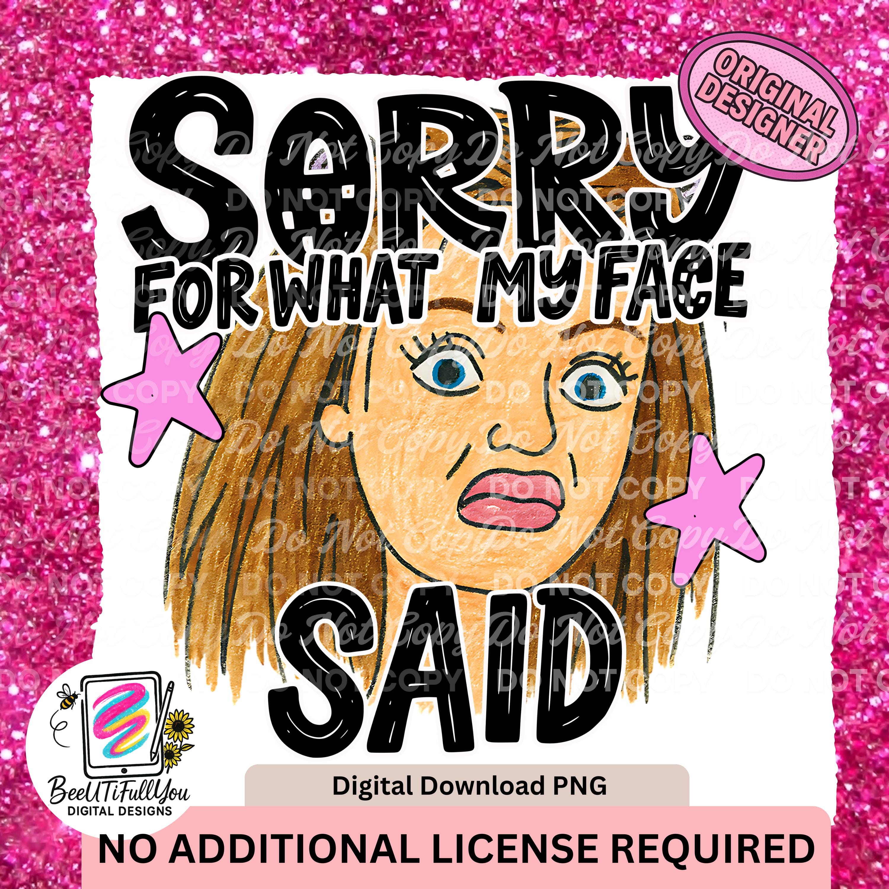 🎨 Design Details: Hand-drawn marker and colored pencil doodle style Playful retro-cartoon facial expression Text reads: “Sorry for What My Face Said” Bright pink stars and bold black lettering for contrast Isolated on white with transparent background