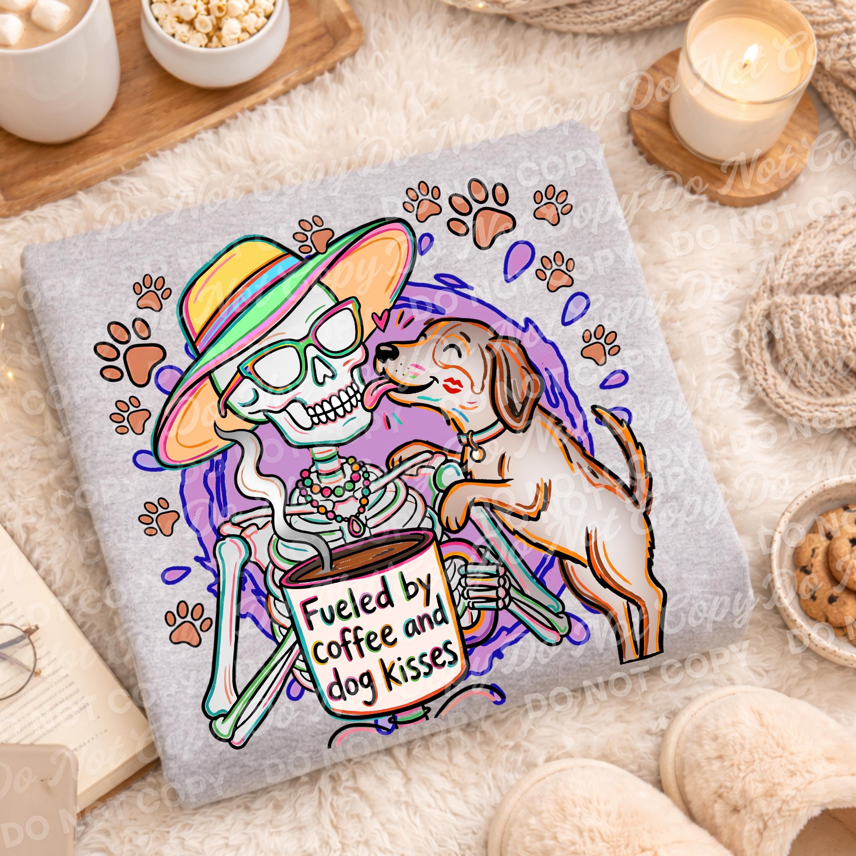 🎨 Design Details ✔ Phrase: “Fueled by coffee and dog kisses” ✔ Style: Cute spooky / trendy cartoon ✔ Bright, fun color palette ✔ Skeleton + dog illustration ✔ Perfect mix of cozy + playful vibes